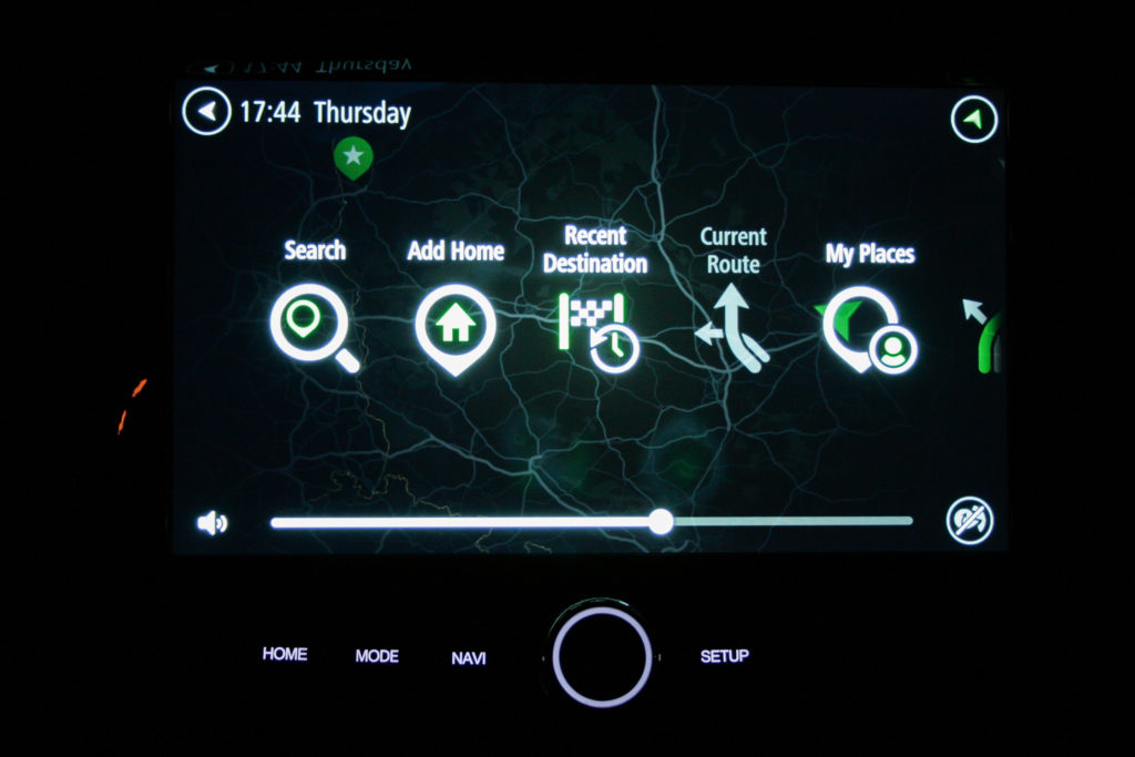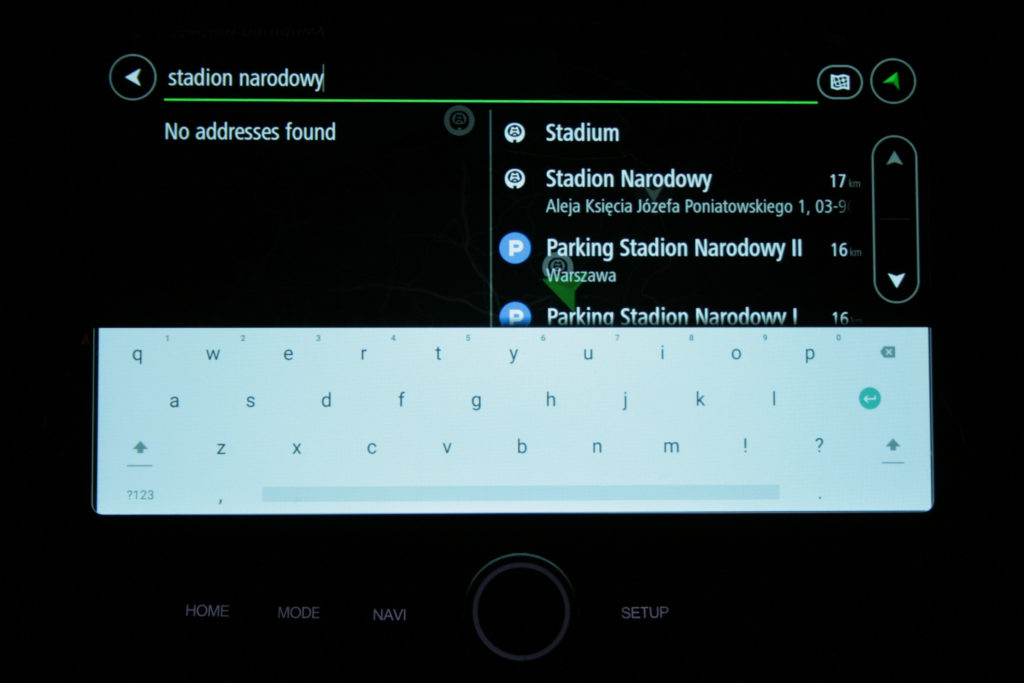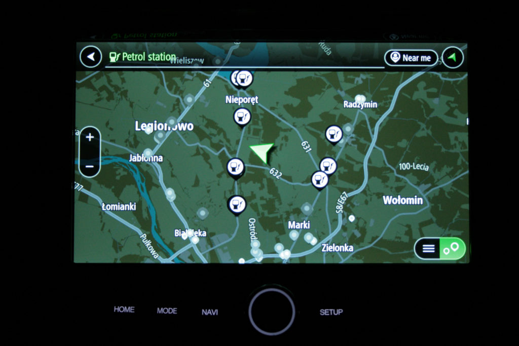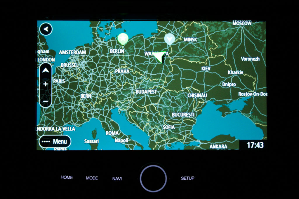 Opcjonalna nawigacja z ekranem o przekątnej 9,2″ jest zaskakująco dobra. Tak jak reszta systemu info-rozrywki, jest ona bardzo przejrzysta i prosta w obsłudze. Nawigacja wyszuka niektóre lokalizacje z nazwy, więc nie zawsze konieczne jest wpisanie adresu. Wyszukiwanie celu podróży bardzo ułatwia dynamiczny i szybko reagujący na dotyk ekran oraz płynne animacje. Istnieje opcja wyszukania pobliskiego parkingu oraz stacji benzynowej. Można skorzystać również z komend głosowych. System info-rozrywki bardzo pozytywnie mnie zaskoczył. Po wrzuceniu biegu wstecznego ekran zajmuje kamera cofania o wysokiej rozdzielczości. W nocy pojawia się drobne ziarno, ale nadal spełnia swoje zadanie. Nie wyobrażam sobie cofania tym samochodem bez niej.