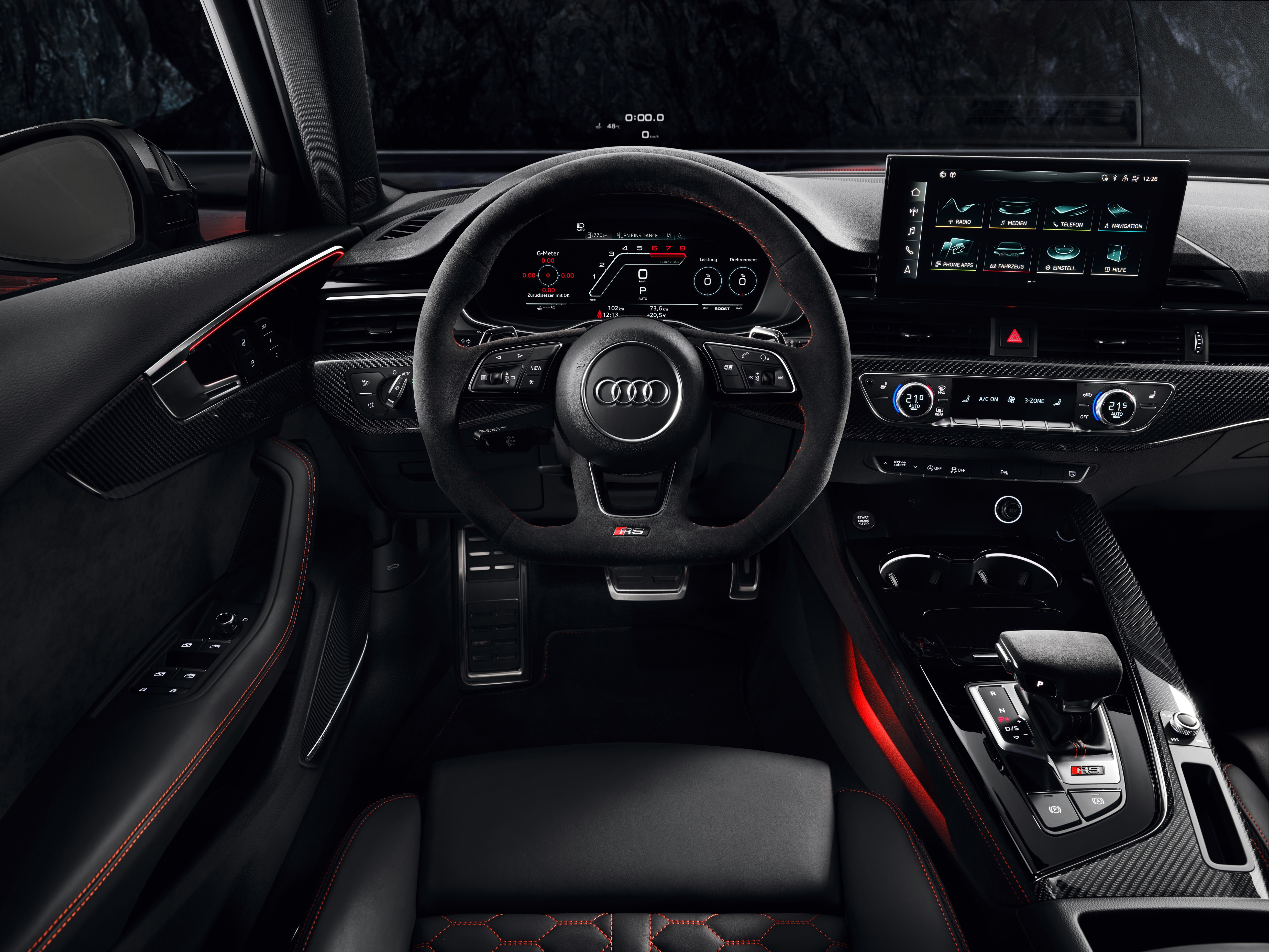 Wnętrze Audi RS 4 Avant utrzymane jest w całości w czerni. W konturach drzwi i w krawędziach konsoli środkowej znajdują się diodowe pasma świetlne, których kolor światła w ramach opcjonalnego pakietu oświetlenia nastrojowego Ambiente zmieniać można w aż 30 odcieniach. W kabinie obecne są emblematy RS, a deskę rozdzielczą zdobi ekran o rozdzielczości 10,1 cala. Przed oczami kierowcy umieszczono cyfrowe zegary, gdzie możemy wyświetlać informacje na temat ciśnienia w oponach, momentu obrotowego, mocy wyjściowej, temperatury oleju w silniku, czasów okrążeń, pomiarów przyspieszenia i sił przeciążenia.