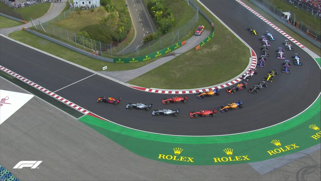 15:24 – LAP 9 – Na powtórce widać, że było bardzo ciasno na starcie i Giovinazzi był wzięty w kleszcze przez Russela i Strolla