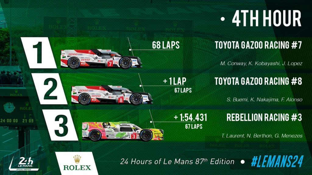 21:52 – Bolidy z numerami #8 #4 #10 klasy LMP1 w boskie