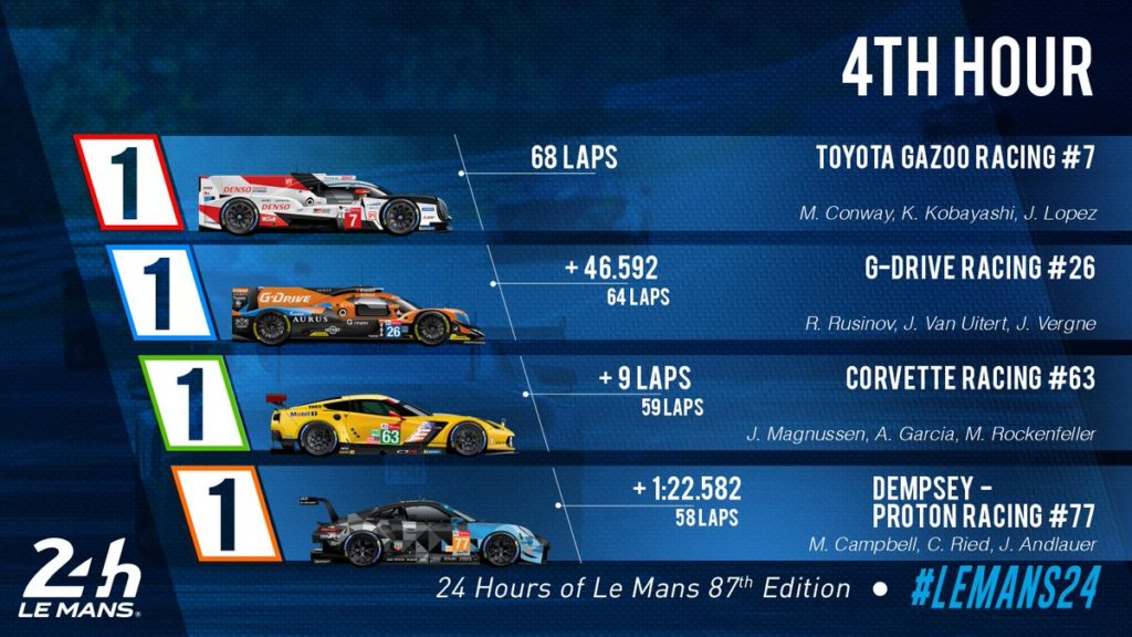 23:27 – Aston Martin #98 | DEMPSEY – PROTON RACING (Porsche) #88 | DRAGONSPEED #10 | CORVETTE RACING #64 – te samochody wycofały się z wyścigu