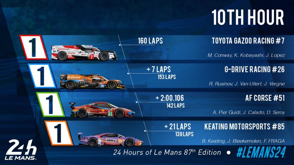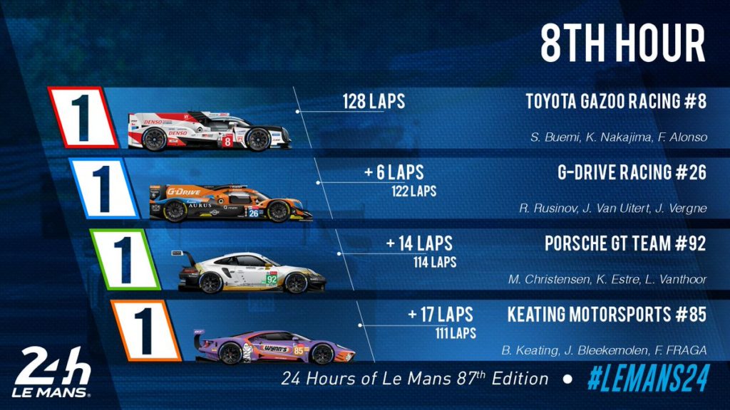 22:13 – Czołowy samochód, czyli Toyota #8 była 10 razy w boksie i przejechała 115 okrążeń