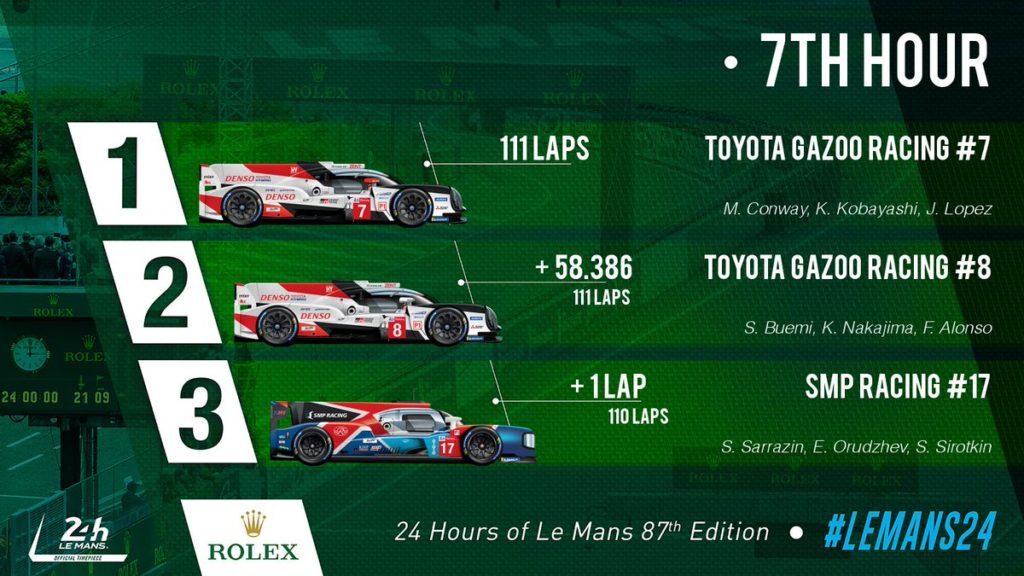 15:13 – Toyota #7 ustanowiła najszybszy czas okrążenia wyścigu 3:17.425