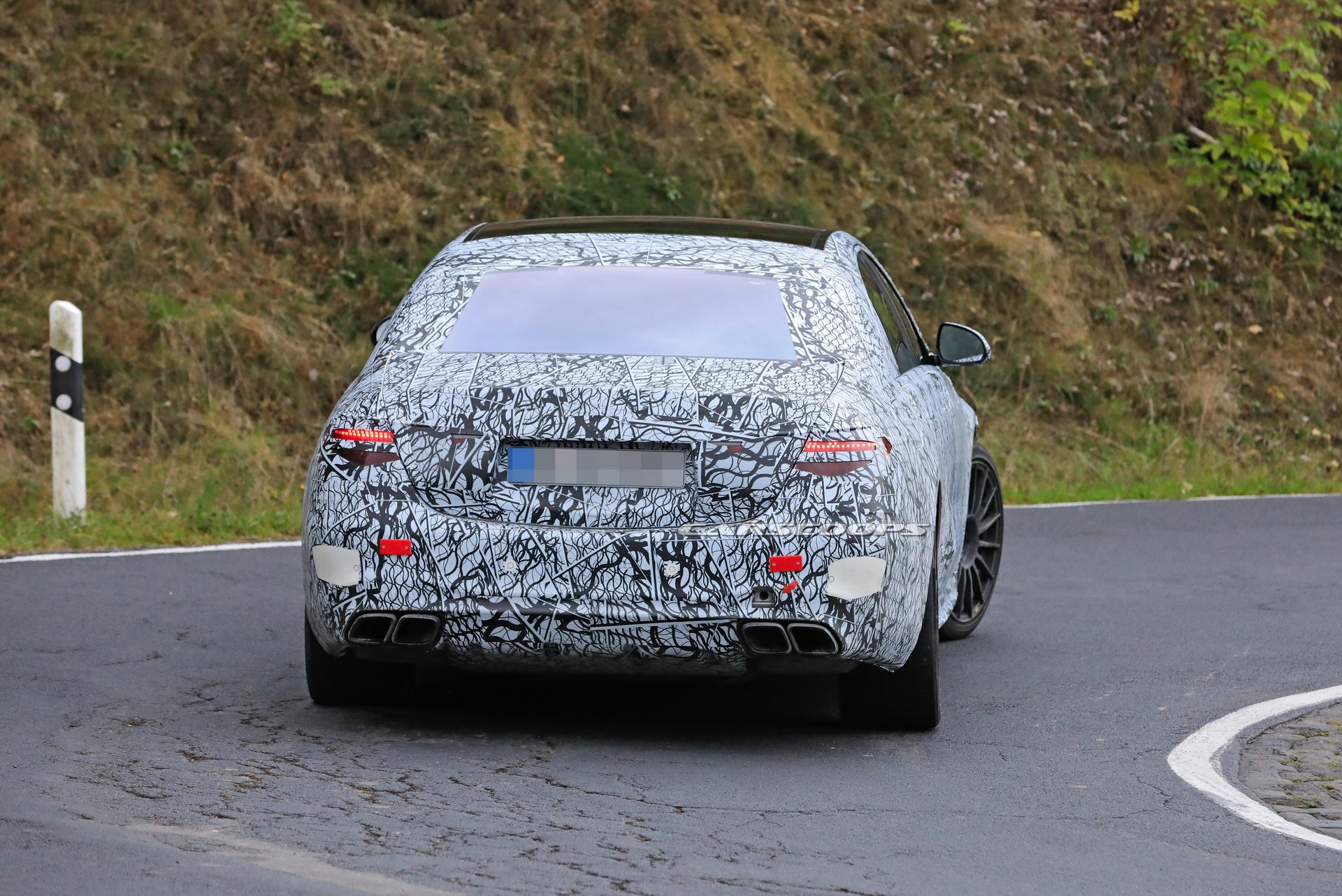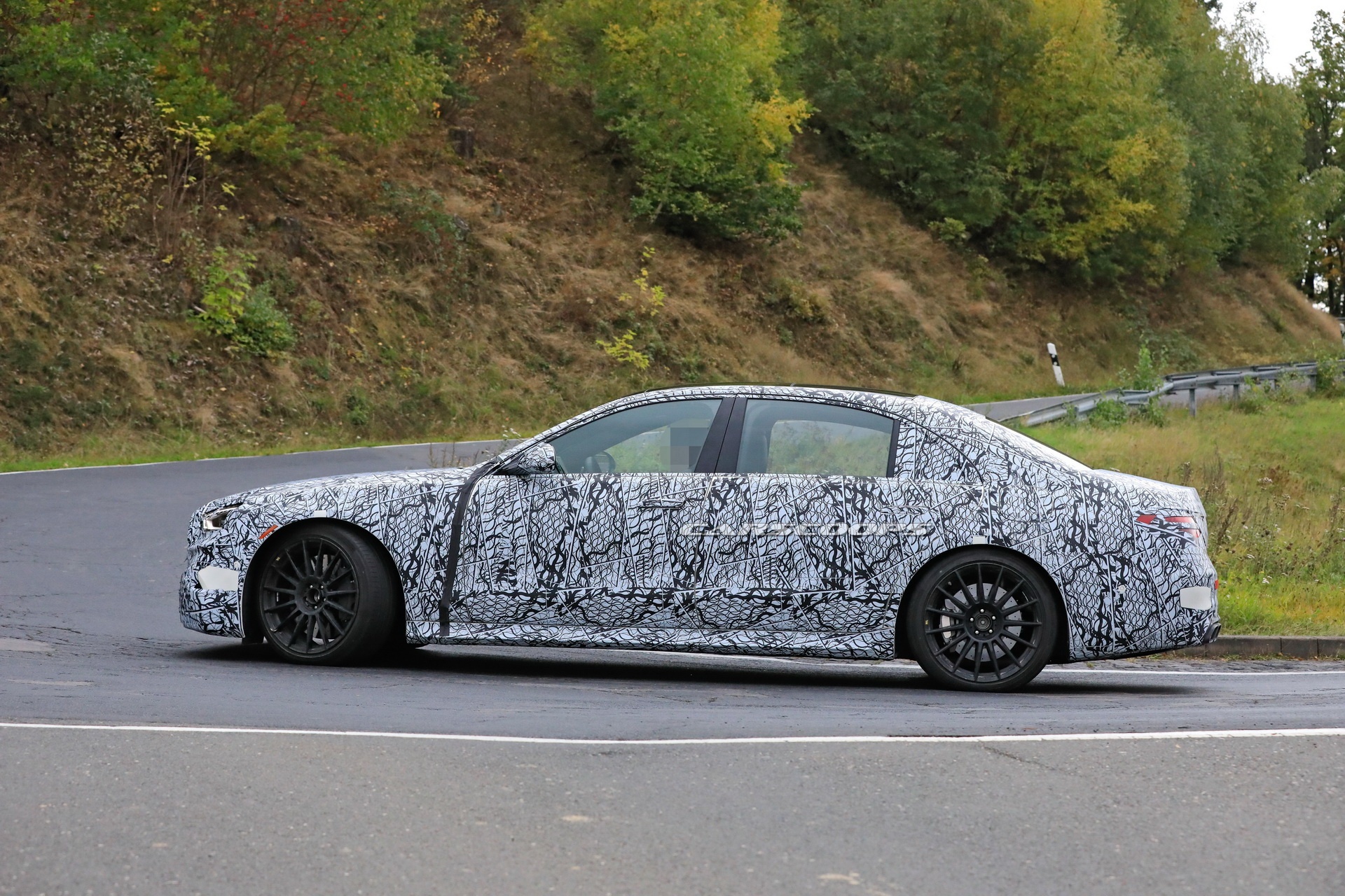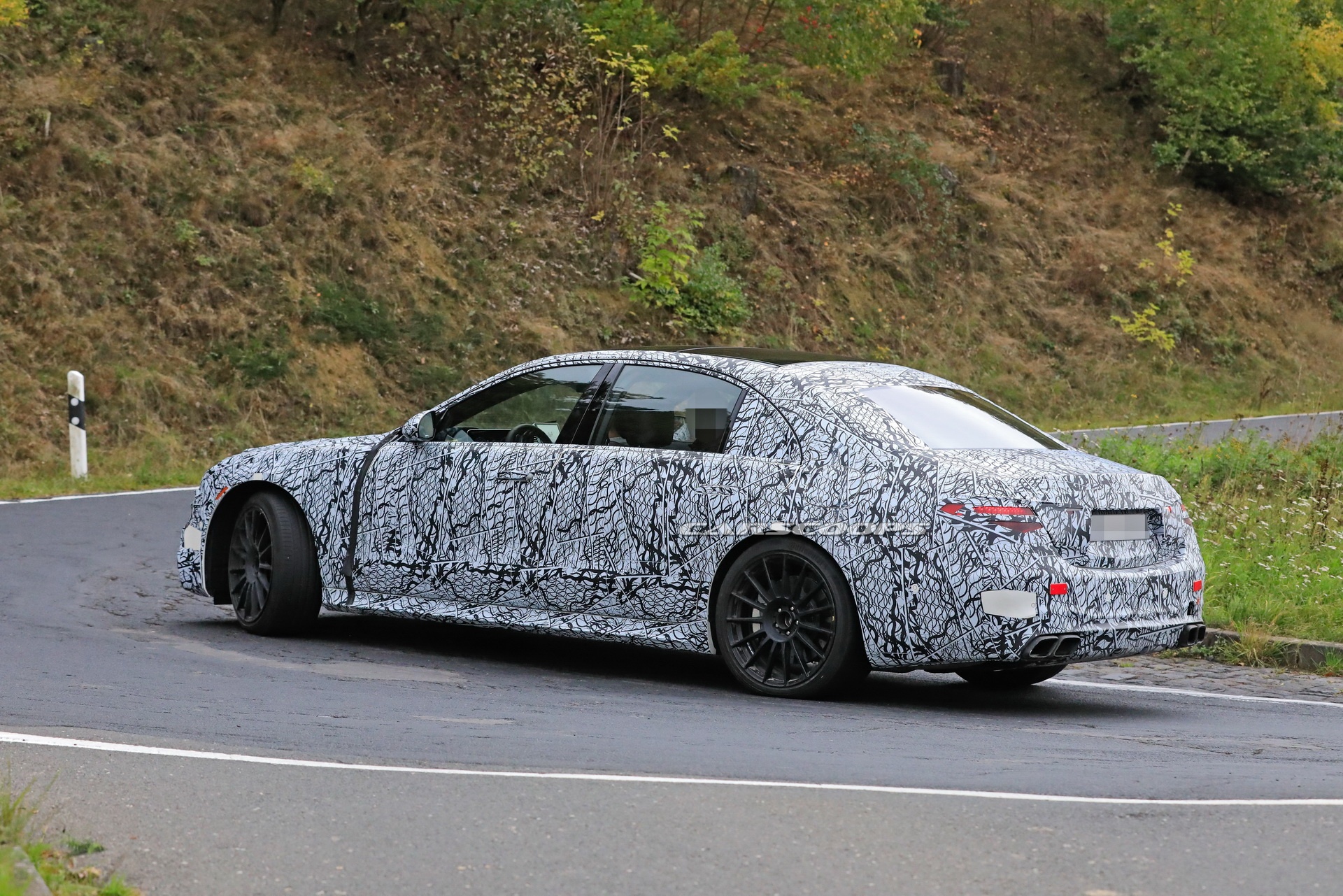 Fotografowie portalu Carscoops przyłapali ten właśnie samochód podczas testów na drogach publicznych. Jak widać, egzemplarz ten został pokryty dezorientującym kamuflażem na całej swojej powierzchni. Natomiast wprawne oko od razu dostrzeże charakterystyczny kształt Klasy S, jej światła, a w dodatku kilka wskazówek świadczących o tym, że pod maską najpewniej pracuje ręcznie składany silnik AMG. Mimo iż nie widać tu żadnego poszerzenia karoserii i zderzaki nie wyglądają jak docelowe AMG (możliwe, że po prostu kamuflaż jest tak dobry), bardzo łatwo dostrzec charakterystyczne elementy wyczynowych wersji Mercedesów, takie jak grill Panamericana z pionowymi żeberkami, większe felgi oraz cztery końcówki układu wydechowego w kształcie równoległoboku.