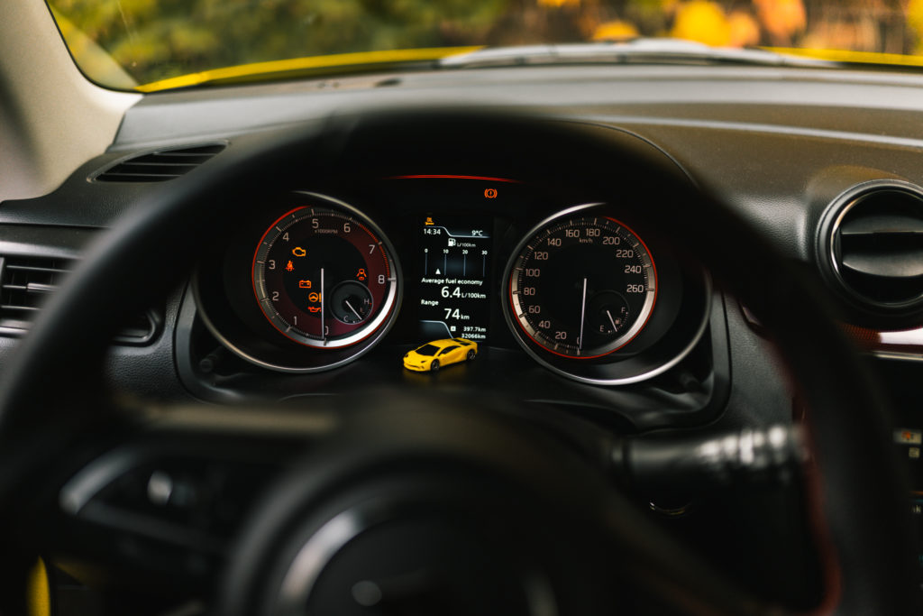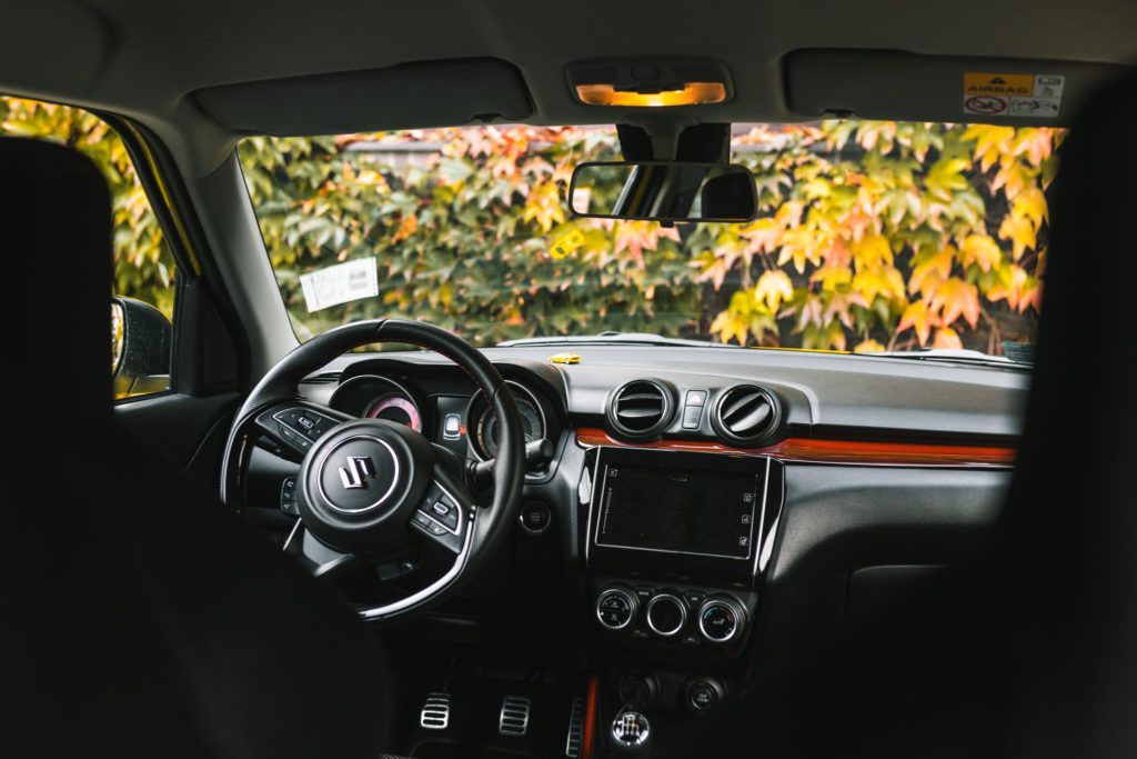 Wspomniałem też już o naprawdę ładnej feldze, ale auto z charakterem poznaje się też po tym jak brzmi. No cóż…Swift nie brzmi, i to mimo prawdziwej podwójnej rury wydechowej. Niestety norma WLTP zabija brzmienie, a Euro 6 zobowiązuje. Na pocieszenie zostaje widok dwóch dość gęstych dymków po obu stronach auta we wstecznym lusterku na światłach. Jednak na pocieszenie fakt, że Suzuki nie idzie za obecnym trendem montowania 3-cylindrowych silników i mamy tu tradycyjną rzędową czwórkę. Przy silniku będąc muszę wspomnieć o spalaniu. Zrobiłem tym autem ok 600 km, na dystansie których kanarek spalił 5,8 l / 100 km. Deklarowane średnie mieszane – 5.6 l, tak więc bardzo blisko. Jeżdżąc eko w trasie idzie wyciągnąć ok 5.1 l. Niestety mały bak ogranicza zabawę do max 400-450 km.