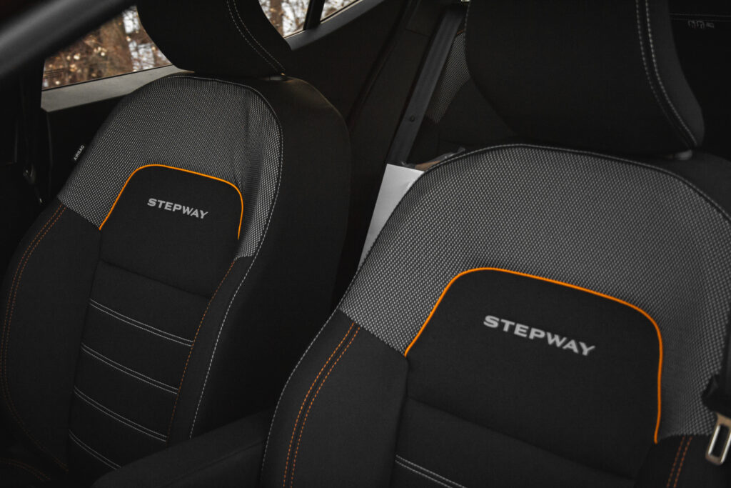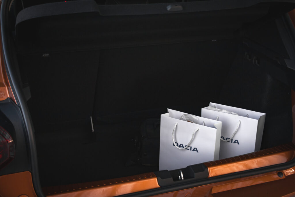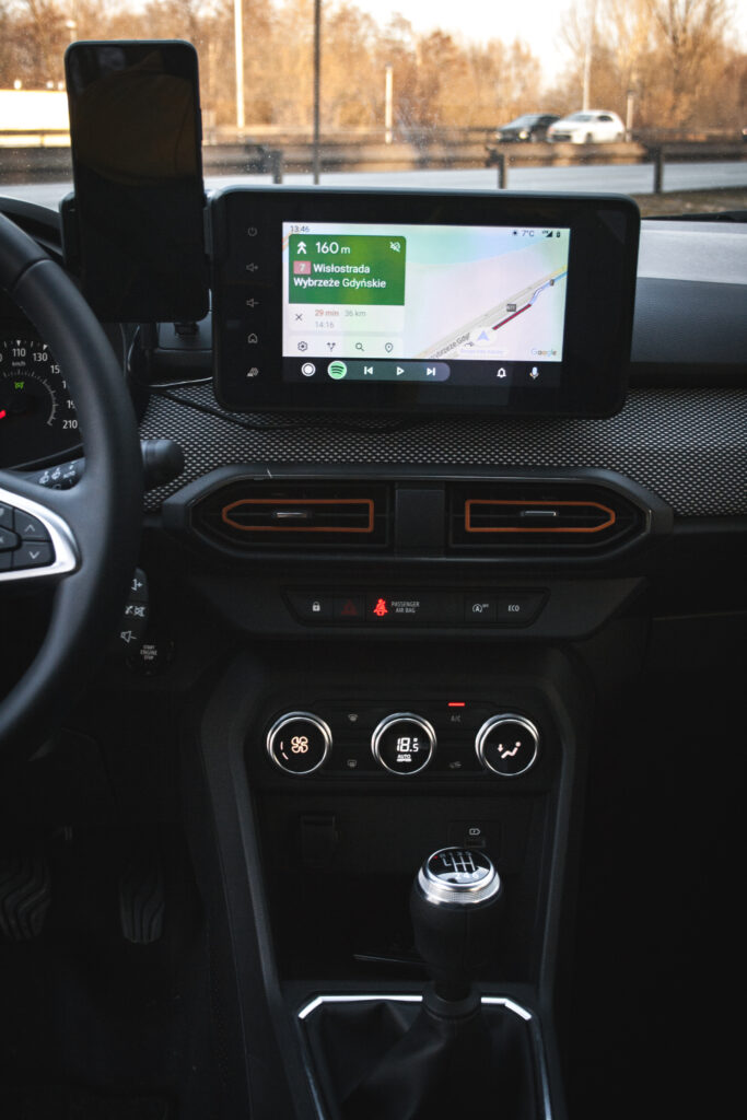 Bez względu na to czy mamy do czynienia z miejskim Sandero czy odmianą Stepway, miejsca wewnątrz jest zdecydowanie wystarczająco. Niewiele mi brakuje do dwóch metrów wzrostu, a mimo to bardzo komfortowo zająłem miejsce za kierownicą oraz z tyłu. Dach prawie w ogóle nie opada, więc tylni pasażerowie mają sporą swobodę ruchu głowy. Mają też łatwy dostęp do świeżego powietrza, gdyż tylne szyby również są elektryczne. (Należy jednak pamiętać, że testowane egzemplarze były wypasione pod względem opcji.) Pomiędzy fotelami znajdują się dwa rozsądnych rozmiarów uchwyty na napoje, obok nich małe wgłębienie na drobne przedmioty oraz gniazdo 12V dla pasażerów z tyłu. Kierowca i przedni pasażer mają natomiast do dyspozycji gniazdo 12V oraz USB pod panelem klimatyzacji. Ten port USB służy jedynie do ładowania urządzeń. Połączeniem multimedialnym zajmuje się drugi, umieszczony sprytnie między daszkiem zegarów a ekranem na desce rozdzielczej. Za jego pośrednictwem możemy połączyć nasz telefon z androidem z samochodem poprzez usługę Android Auto. Co ciekawe, jest nawet fabryczny uchwyt na telefon, tuż przy tym gnieździe! Jest też Apple Carplay dla posiadaczy iPhone’ów. Jednak jeśli jesteś masochistą i mimo przygotowania systemu pod obsługę obu tych aplikacji chcesz używać nawigacji wbudowanej, ucieszysz się, gdyż jest całkiem w porządku, pod warunkiem, że aktualizujesz na bieżąco mapy. Bagażnik jest całkiem rozsądnych rozmiarów, ustawny, symetryczny. Pomieści 328 litrów bagażu.